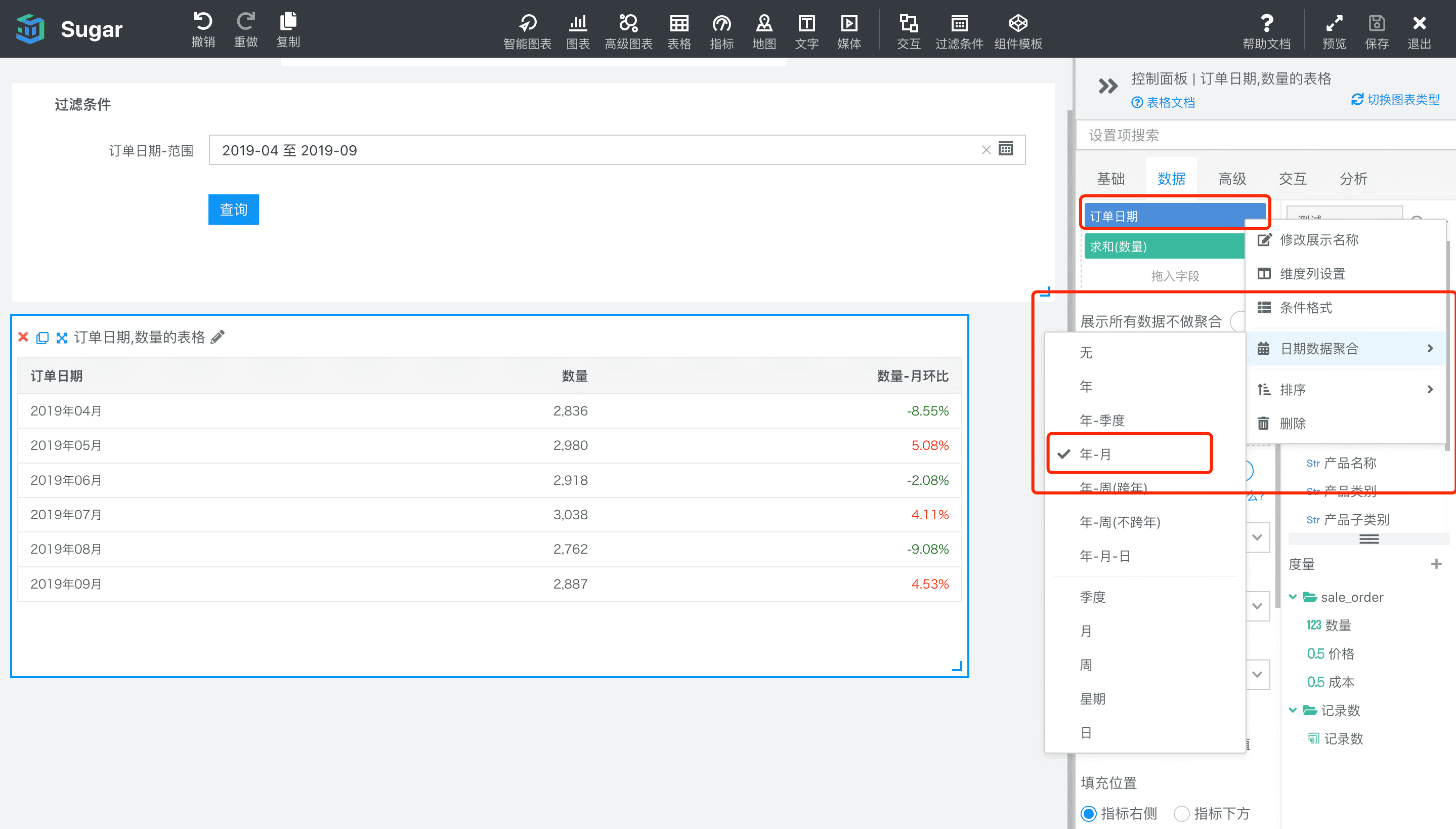 当日期字段选择了「日期数据聚合」时,此时「数量」会按照「年-月」日期粒度进行聚合