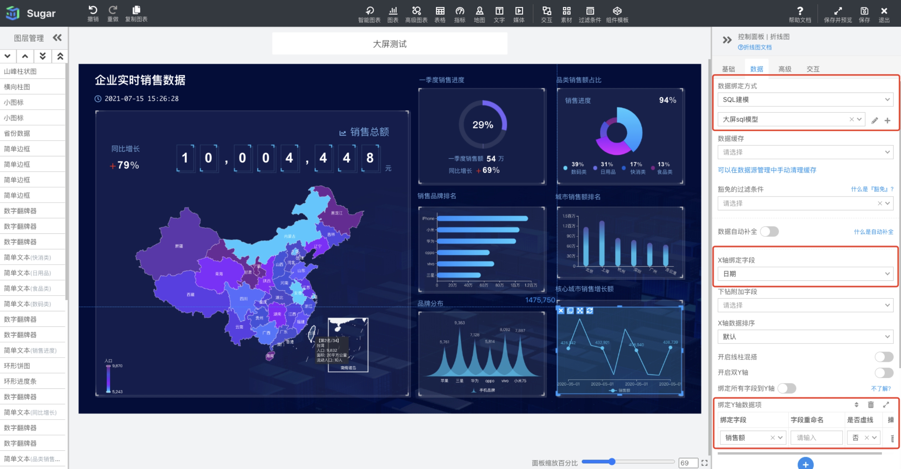 最重要的就是绑定图表的数据,此处以右下角的折线图为例,单击折线图表来选中,如下图来使用 SQL 方式绑定图表数据:
